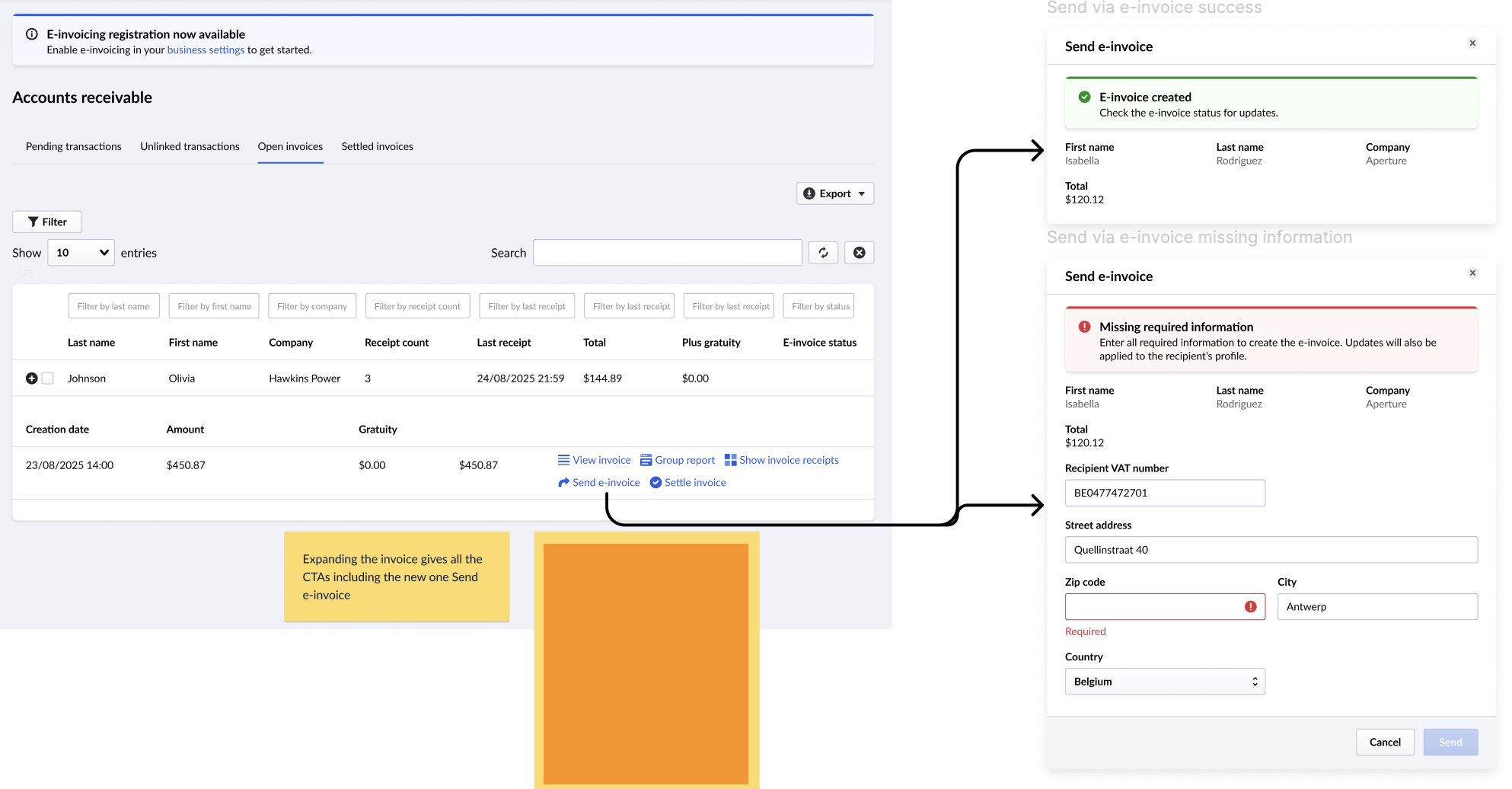 - Split bills to business customers require separate e-invoices for each.